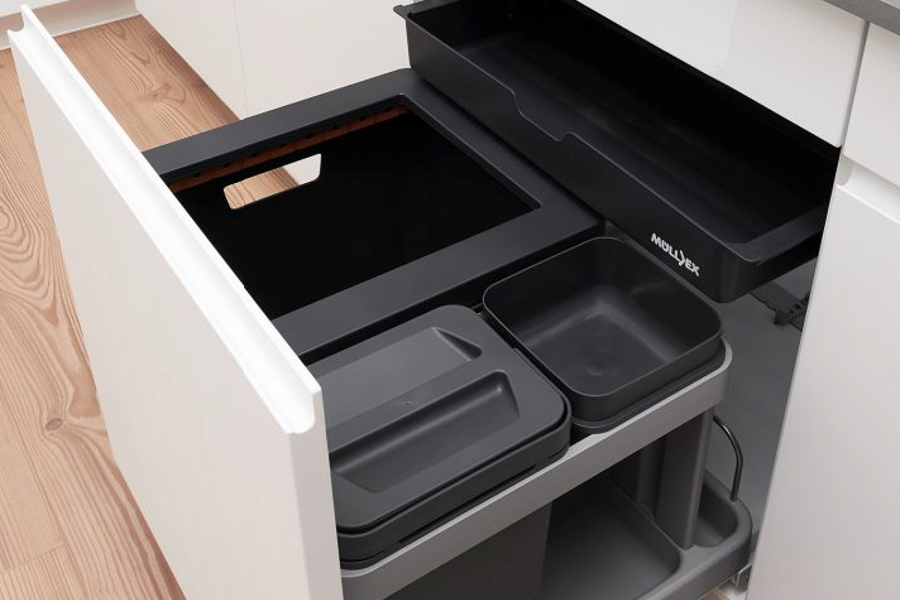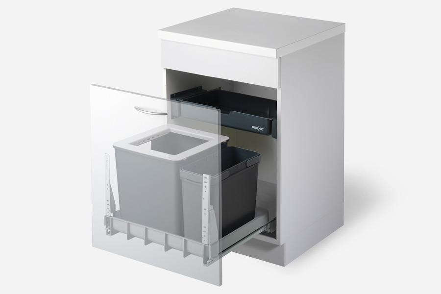 Unser BOXX-R Abfallsystem ist nicht nur ein Spezialist für hohe Gewichte. Das System wird einfach an der bestehenden Front befestigt, anschliessend wird das Abfallsystem in den Müllex Auszug eingesetzt. Der Auszugsboden begeistert mit einer hochwertigen und geräuscharmen Rollschubführung. Er ist ausserdem mit bis zu 100 Kilogramm belastbar.