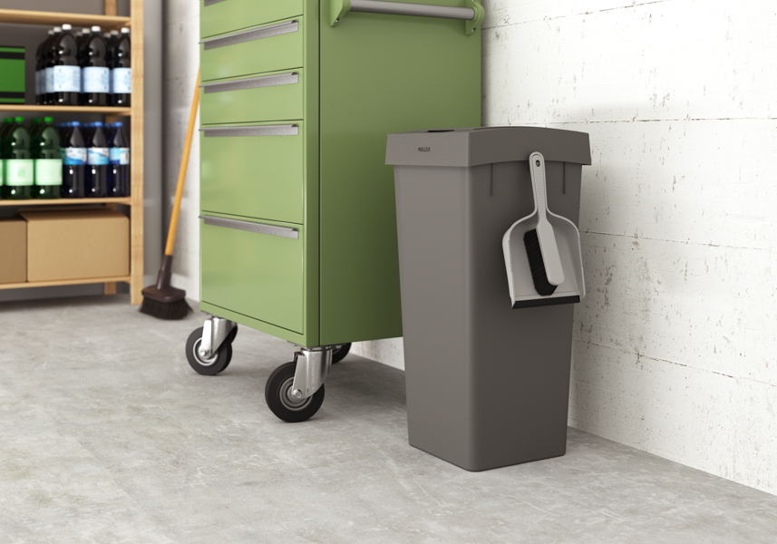 Unser frei stehendes Müllsystem ist in Anthrazit erhältlich und besteht aus robustem Material. Dank seiner Technologie ist die Handhabung dieses Mülltrennsystems äusserst praktisch. Der schwenkbare Deckel mit Gegengewicht schliesst sich automatisch, wenn kleine Abfallgüter mit der Push-Funktion entsorgt werden, während er bei grösseren Abfallgütern oder einem bereits vollen Müllsack mit der Pull-Funktion angehoben werden kann. Darüber hinaus verfügt der Behälter an seiner Aussenseite über einen kleinen Haken, an dem eine Kehrgarnitur angebracht werden kann, was die Reinigung der Küche noch einfacher macht.