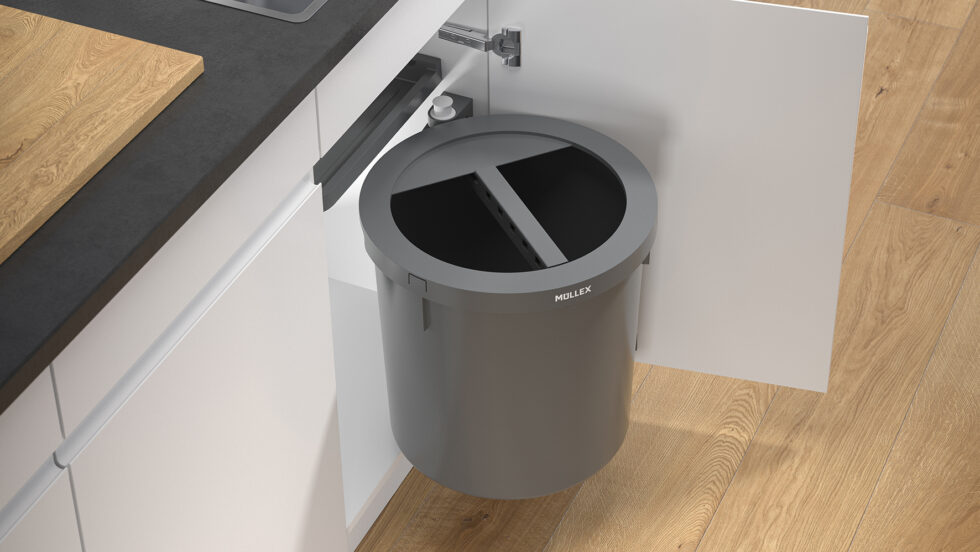 Systeme für Drehtüren: Müllex bietet speziell für Küchenschränke mit Drehtüren konzipierte Abfallsysteme an. Diese Systeme sind ideal für diejenigen, die eine diskrete und effiziente Abfalltrennung innerhalb des Schranks bevorzugen. Sie nutzen den vorhandenen Raum optimal und sind einfach zu installieren.