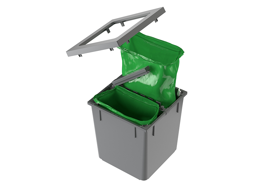 Viele moderne Küchen sind heute mit einem Auszugssystem wie der X-LINE ausgestattet. Hier bieten sich Zusatzbehälter für die Bioabfallsammlung an. Diese kleinen Einsätze passen perfekt in bestehende Systeme und lassen sich mit einem passenden Spannrahmen ausstatten, damit kleine Kompostsäcke sicher fixiert bleiben.