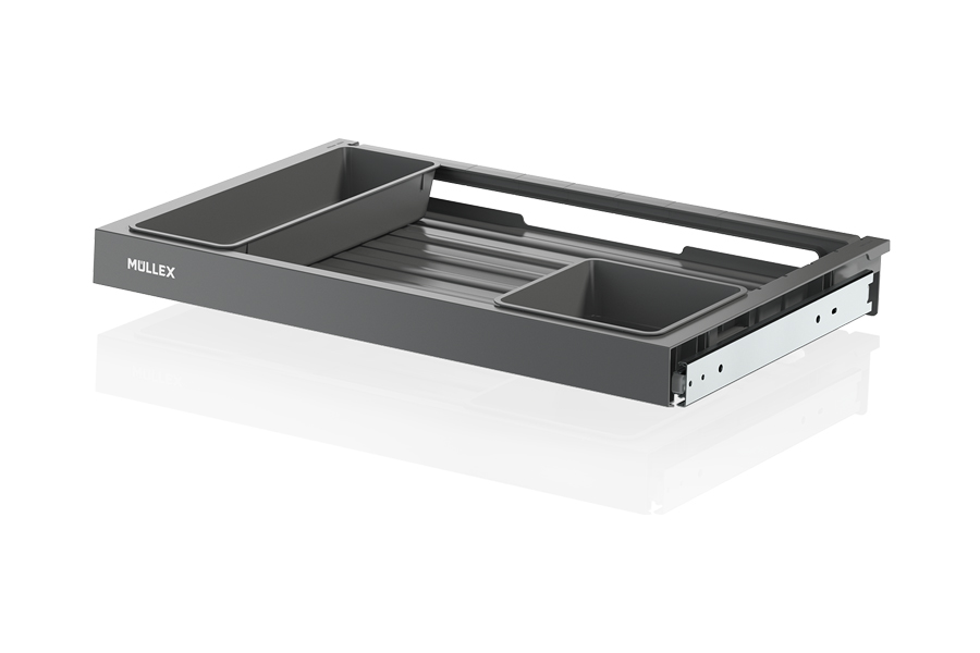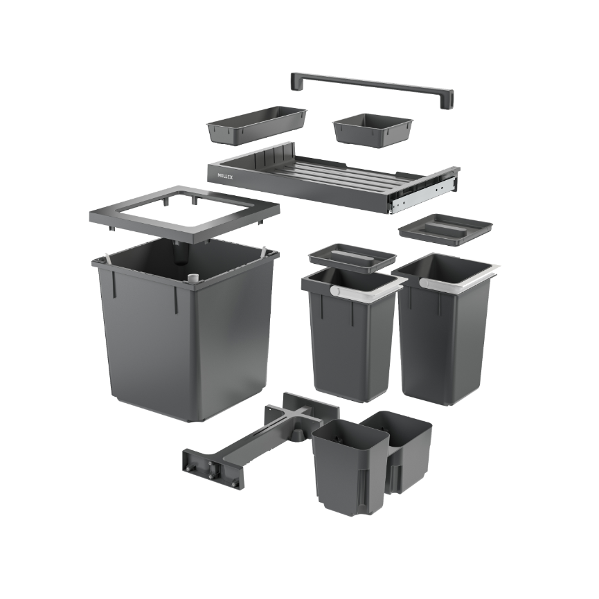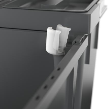 Un nouveau système à cliquet breveté positionne les poubelles. La manipulation et l’assemblage sont extrêmement faciles et permettent un assemblage sans outil dans tous les systèmes de tiroirs disponibles dans le commerce. La flexibilité du système garantit qu’un seul modèle qui s’adapte à tous les tiroirs d’une largeur de 450 à 900 mm et d’une profondeur de 400 à 500 mm.