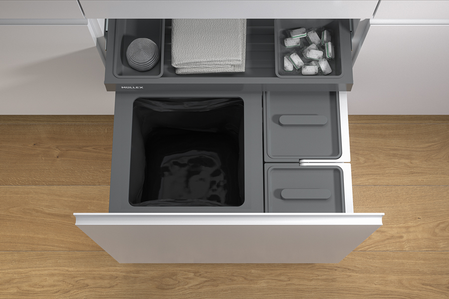 Questi non devono essere utilizzati esclusivamente per la raccolta differenziata dei rifiuti. Possono essere utilizzati anche per riporre spugne, spazzole e prodotti per la pulizia. Müllex si affida al principio del contenitore nel contenitore. In questo modo ogni contenitore è accessibile dall'alto.